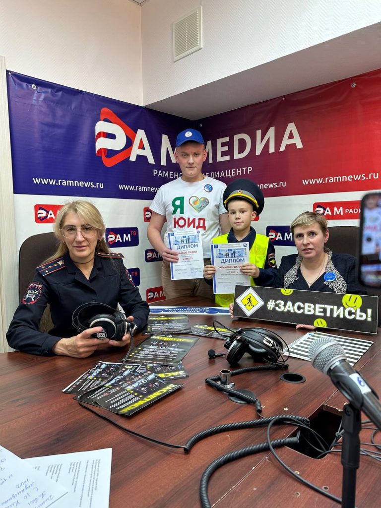 2.Рубрика «Актуальный разговор». Гости студии — Светлана Кислякова — муниципальный координатор ЮИД, Татьяна Коренкова — инспектор по пропаганде БДД МУ МВД России «Раменское», Даниэль Охрименко и Павел Байков, ведущая Елена Перетокина.