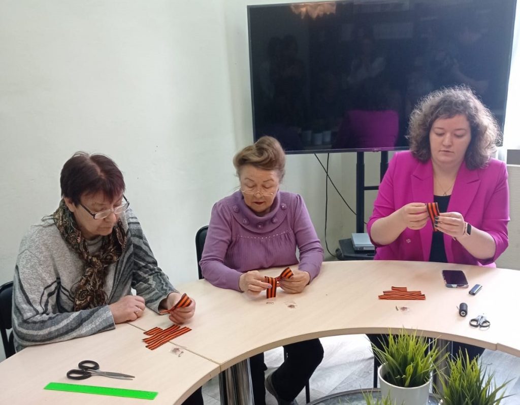 Представители старшего поколения собрались, чтобы создать собственными руками праздничную брошь. Из георгиевской ленточки с помощью клея и значка с пятиконечной звездой они сделали украшения, которые передадут ветеранам.