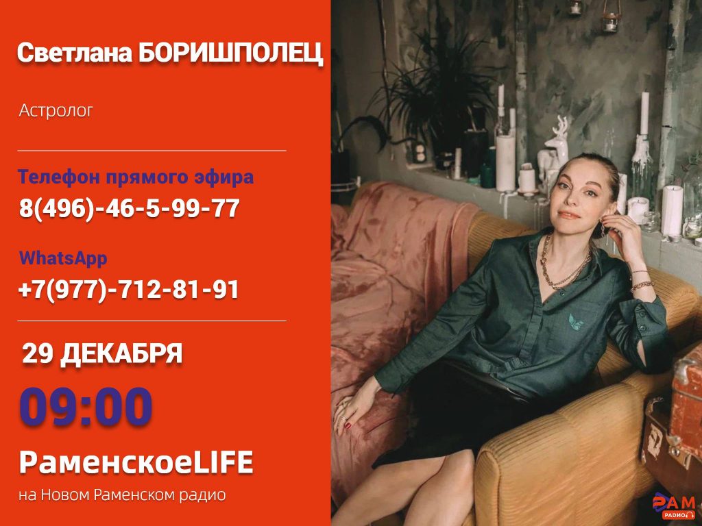 ?Что готовит новый год и как встречать его главного героя, Дракона, расскажет завтра в праздничном выпуске утреннего шоу «Раменское LIFE» астролог Светлана Боришполец. Встречаемся 29 декабря в 9-00.