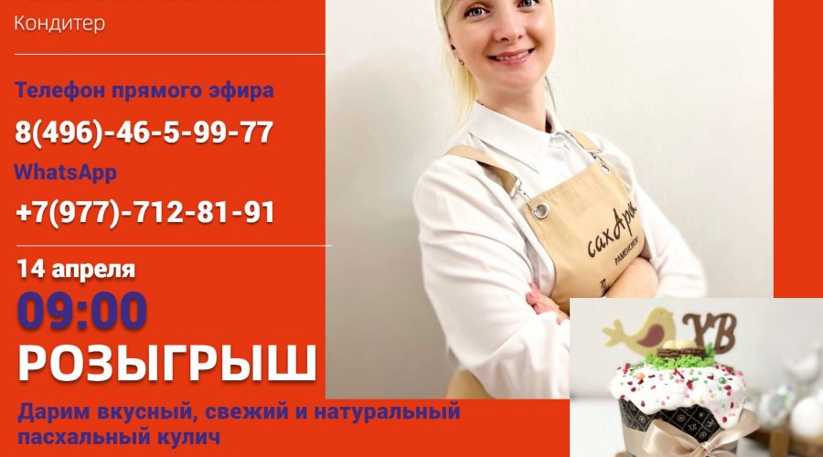 Победителя выберем рандомно в пятницу 14 апреля во время утреннего шоу «Раменское life». В этом нам поможет кондитер Анна Старостина, известная своими ирисками, шоколадными букетами, орешками, трубочками и другими сладостями, перемещающими в беззаботное детство. А еще Анна расскажет, как стильно украсить кулич и проведет мастер-класс по декупажу пасхальных яиц.