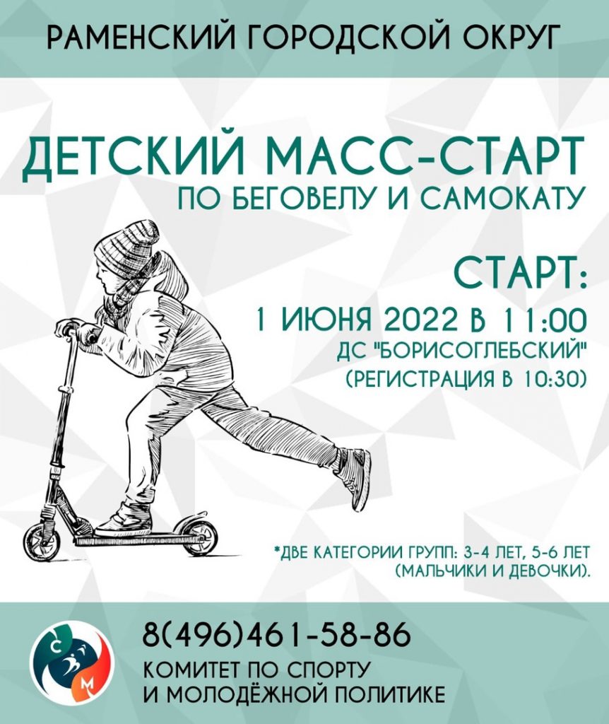 1 июня в чаше Борисоглебского озера по адресу: г. Раменское, ул. Махова, д. 18/1 (центральный вход) пройдёт детский масс-старт Раменского городского округа по беговелу и самокату, сообщает в социальных сетях Комитет по спорту и молодежной политике.