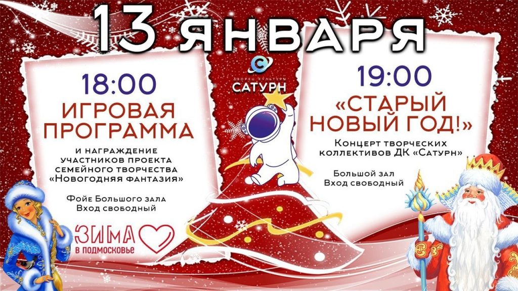 19:00 — концерт творческих коллективов ДК «Сатурн» «Старый Новый год!».
