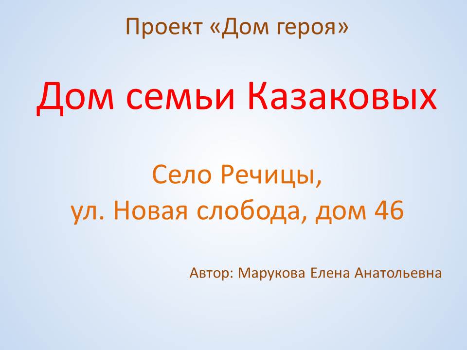 Село Речицы, ул. Новая слобода, дом 46. Этот дом был построен в 1962 году ветераном Великой Отечественной Войны Казаковым Иваном Анисимовичем, его женой Прасковьей Никаноровной (труженицей тыла) и их старшим сыном Алексеем.