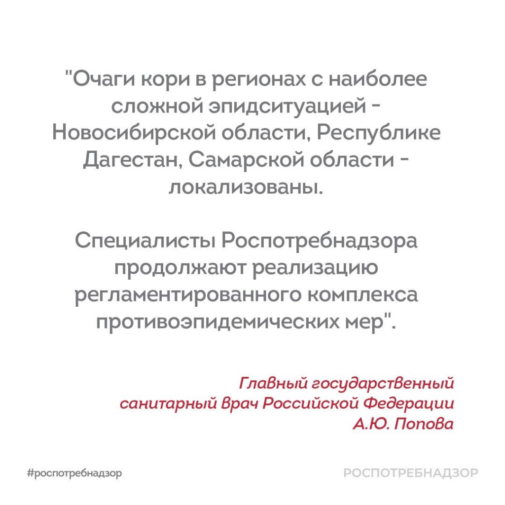 Риски эпидемического распространения кори исключены Руководитель Роспотребнадзора Анна Попова рассказала, как сейчас обстоят дела с заболеваемостью корью и какова вероятность заболеть. За январь-март 2023 года зарегистрировано 1089 случаев кори, однако это всего лишь 0,75 на 100 тысяч населения. Отмечается долгосрочный тренд снижения заболеваемости корью. Для взрослых опасность заболеть меньше – практически все уже переболели. Тем не менее, чтобы понять, какой иммунитет сформировался, необходимо пройти ряд тестов. Затем по результатам проводится подчищающая иммунизация. В среднем по стране охват иммунизацией против кори превышает 95%, что позволяет исключить риски эпидемического распространения заболевания. Более подробную информацию по кори и не только вы можете узнать из интервью руководителя Роспотребнадзора Анны Поповой.