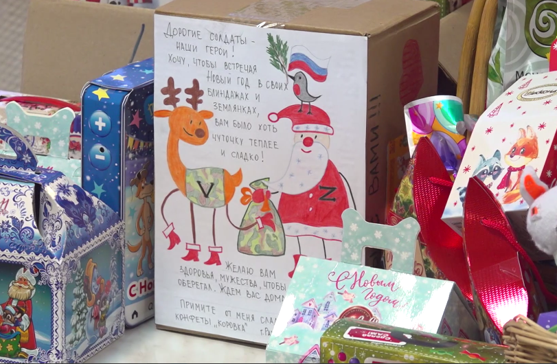 Конечно, под Новый год хочется больше сладостей и игрушек, поэтому корзина все это в себя и вмещает. А еще письма для участников СВО.