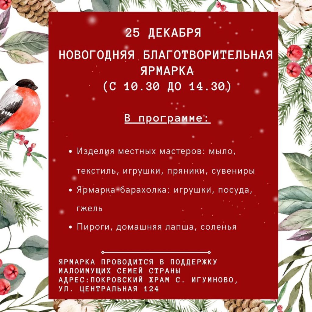 Мероприятие состоится 25 декабря на территории Покровского храма с Игумново. В программе изделия местных мастеров, ярмарка-барахолка, пироги, домашняя лапша, соленья. Ярмарка проводится в поддержку малоимущих семей.