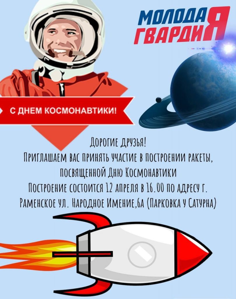 —Раменское отделение Молодой гвардии Единой России приглашает принять участие в построении ракеты из автомобилей, посвященной Дню космонавтики.