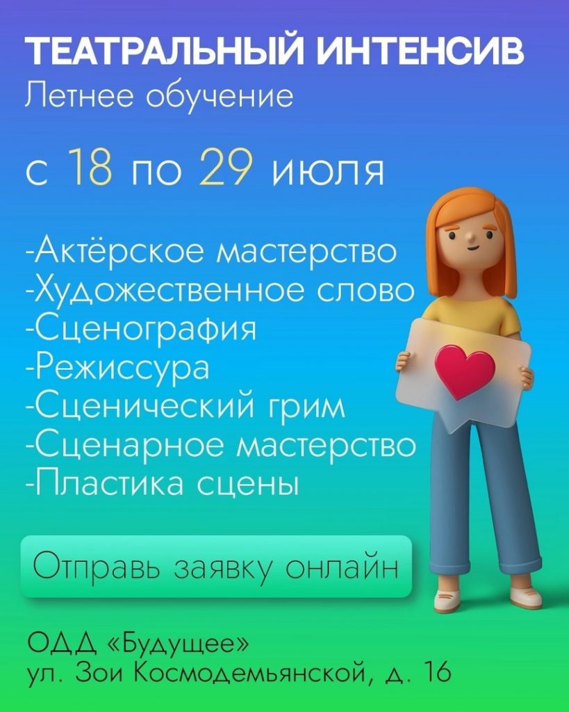 Театральный интенсив — это летние молодёжные дневные обучающие сборы, где вас ждут: