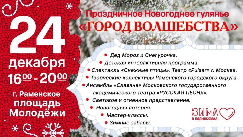 В программе детская интерактивная программа, спектакль «Снежные птицы» от московского театра «Pulsar», выступление творческих коллективов Раменского городского округа, ансамбля «Славяне» Московского государственного академического театра «Русская песня», световое и огненное представление, новогодняя лотерея, мастер-классы, зимние забавы и, конечно же, Дед Мороз и Снегурочка.