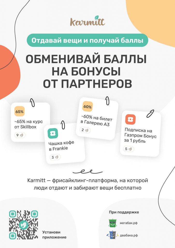 Новая бесплатная онлайн платформа, мобильное приложение по обмену вещами, бывшими в употреблении, зарегистрировавшись в котором можно стать активным участником проекта. В основе проекта «Karmitt» ‒ забота об экологии, снижение объема образования отходов. Здесь можно отдавать и находить вещи бесплатно, за что получать бонусы от партнеров проекта. Чем больше вещей находят новый дом, тем меньше отходов попадает в окружающую среду. Это вклад каждого из нас в будущее планеты, где вещи приобретают «вторую жизнь».
