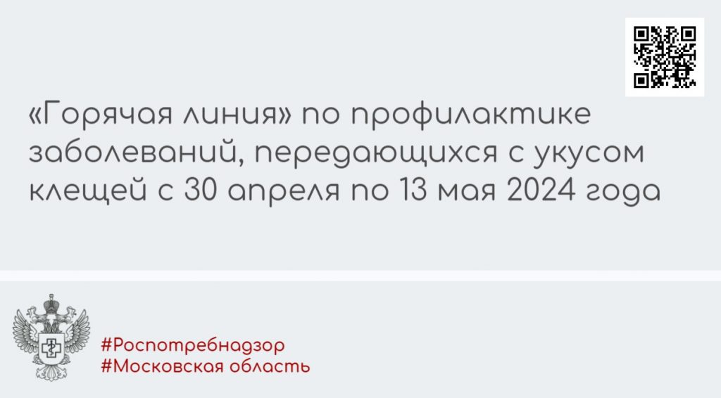 С 30 апреля по 13 мая 2024 года Управлением Роспотребнадзора по Московской области организована работа «горячей линии» по профилактике заболеваний, передающихся с укусом клещей.