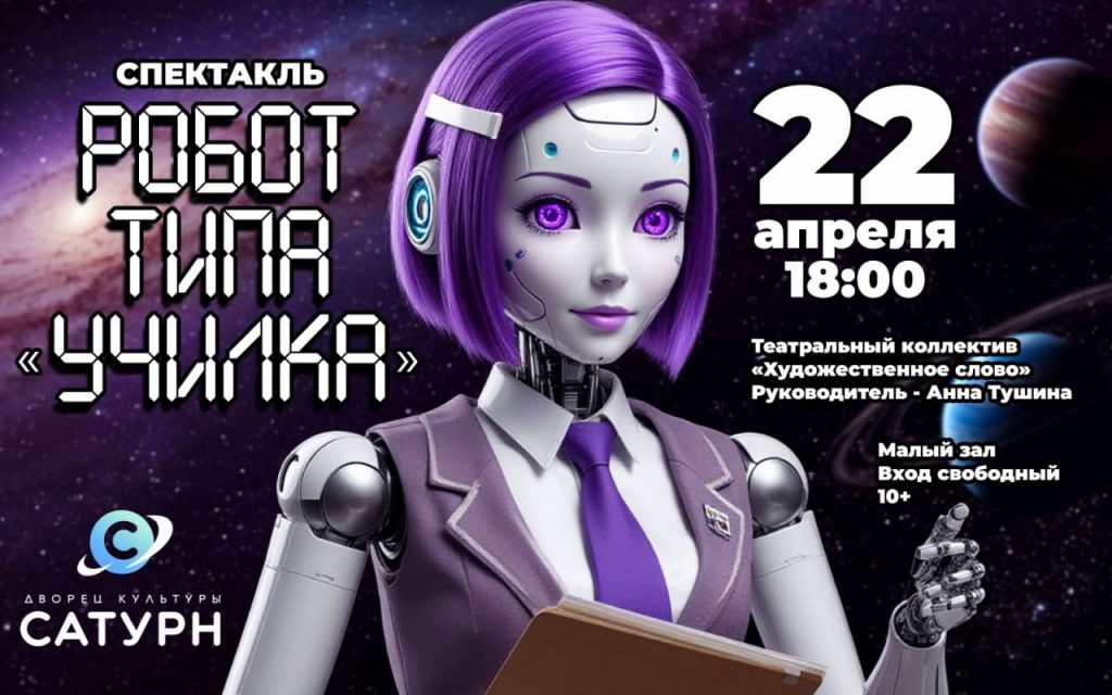 Театральный коллектив «Художественное слово» под руководством Анны Тушиной покажет премьеру спектакля «Робот типа «училка» в Малом зале ДК «Сатурн» 22 апреля. Это фантастическая постановка о будущем, в котором роботы заменили школьных учителей.
