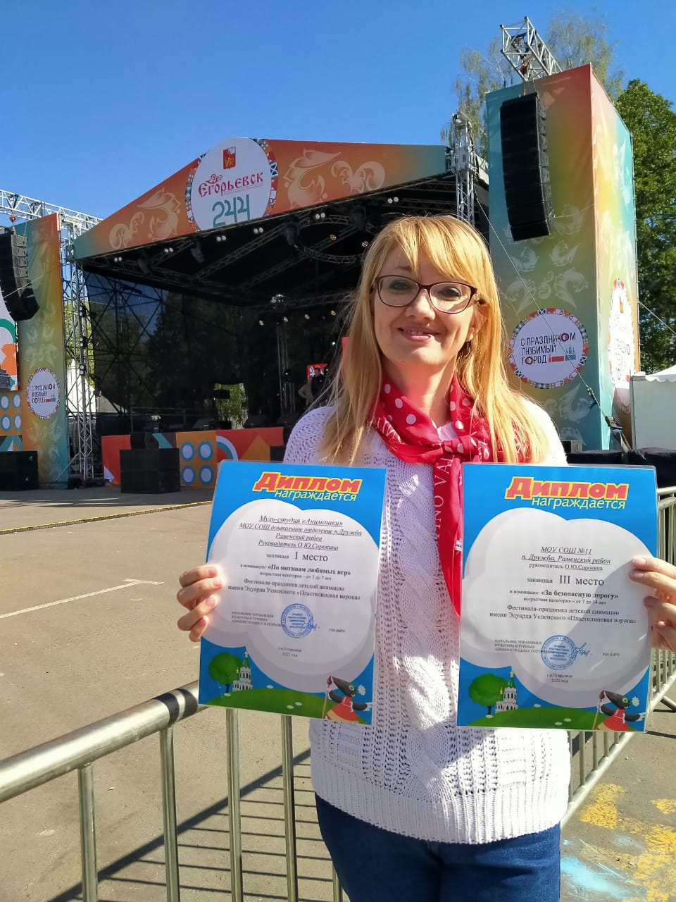 В нем участвовала воспитатель высшей квалификационный категории Оксана Юрьевна Сорокина из дошкольного отделения школы № 11 пос. Дружба. Она заняла 1 место в номинации «По мотивам любимых мультфильмов» (возрастная категория 3-7 лет) и 3 место в номинации «За безопасную дорогу» (возрастная категория от 7-14 лет).