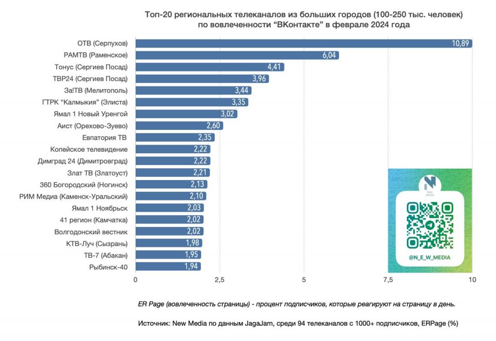 Раменское телевидение вошло в Топ-20 региональных телеканалов из средних городов (100-250 тыс. человек) по вовлеченности «ВКонтакте» в феврале 2024 года