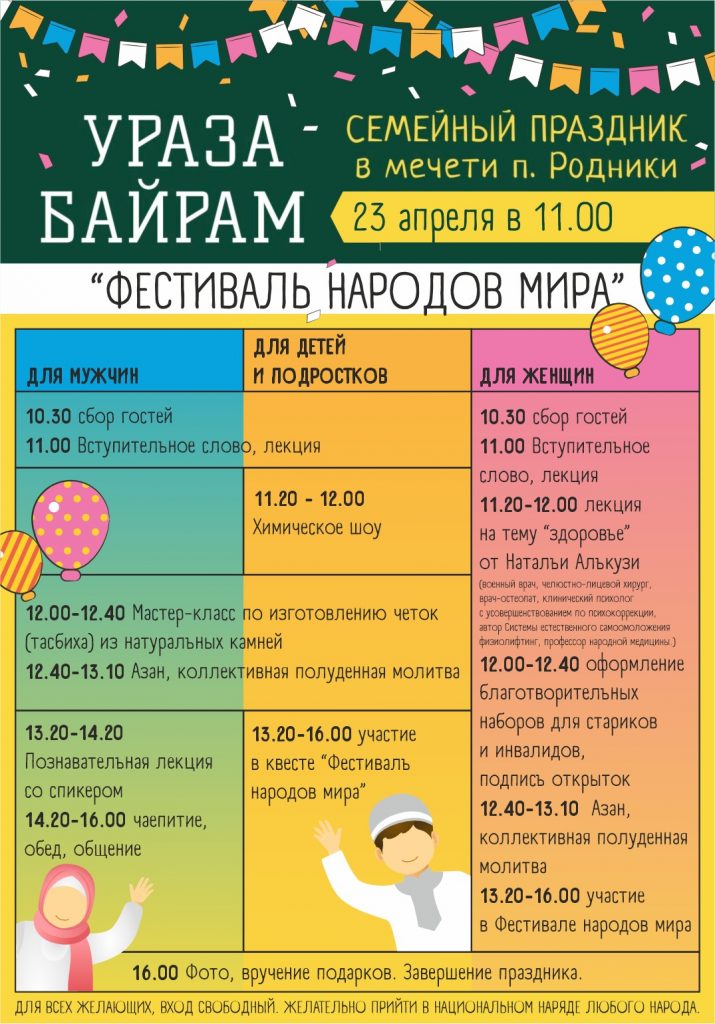 В честь праздника Ураза байрам состоится “Фестиваль народов мира” для взрослых и детей. Приходим в национальных костюмах