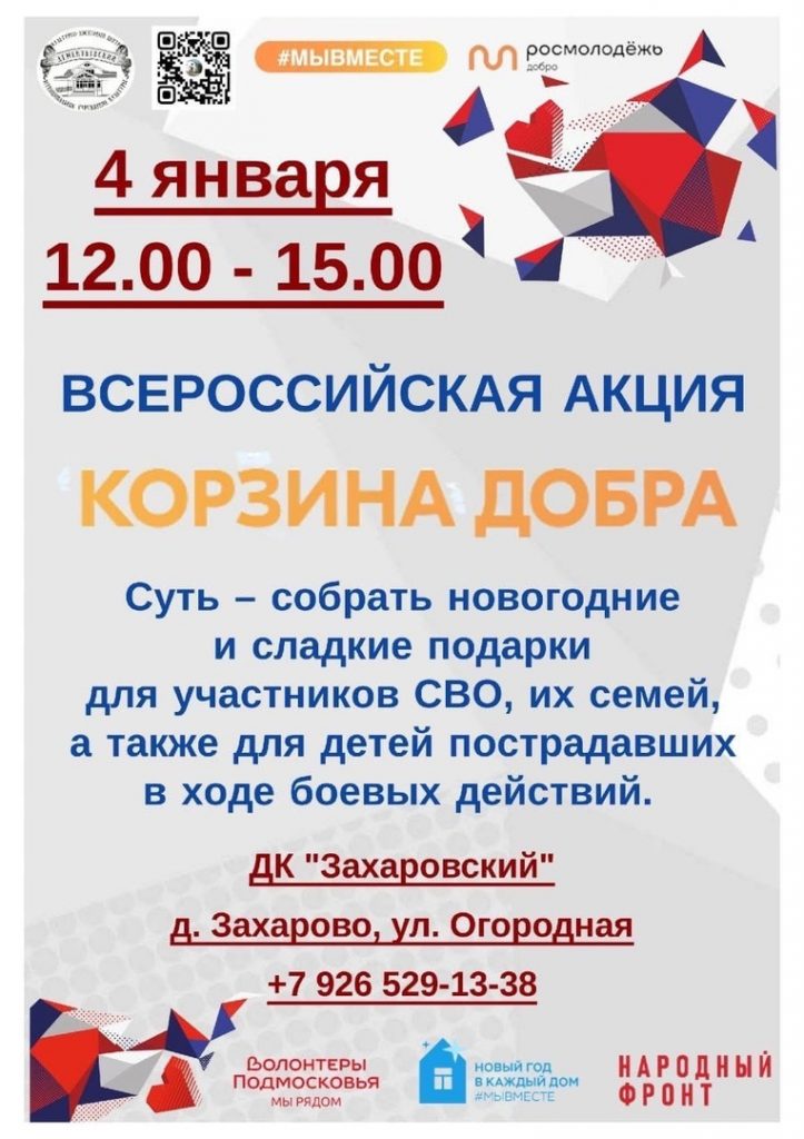 4 января в ДК «Захаровский» пройдет сбор новогодних и сладких подарков для участников специальной военной операции, а также детей пострадавших в ходе боевых действий.