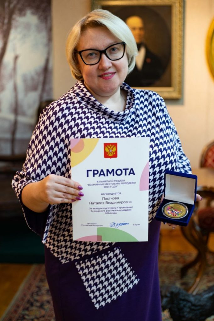 Медаль и грамоту Президента РФ Наталии Постновой вручил глава Раменского муниципального округа Эдуард Малышев. Столь высокую награду она получила «За вклад в организацию и проведение Всемирного фестиваля молодежи и студентов в 2024 году».