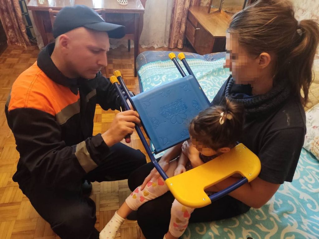 Начальник части Олег Гречаник рассказал, что в единую службу экстренной помощи «Система-112» обратилась женщина, у которой ребенок играя в детской, застрял головой в детском стульчике. Мама самостоятельно освободить ребенка не может.