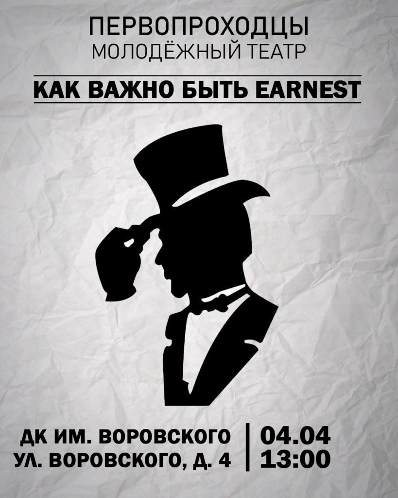 Молодёжный театр «Первопроходцы» выступит на сцене ДК Воровского 4 апреля в 13:00. Они покажут зрителям комедийный спектакль по пьесе Оскара Уайльда «Как важно быть EARNEST». Вот что они сами пишут о постановке: «Название комедии представляет собой каламбур — слово Earnest, означающее по-английски «серьезный», созвучно имени Эрнест, которым представляются два героя пьесы. При этом сколько-нибудь серьезными людьми они не являются». Вход свободный. Подробности в группе @pervtet.
