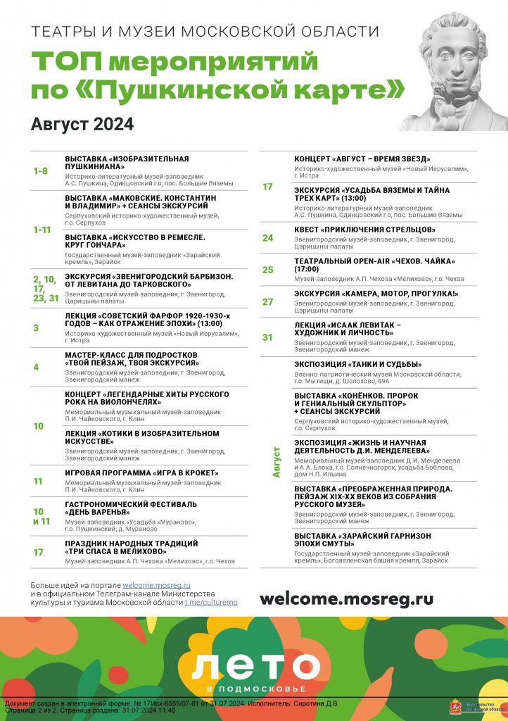 В целях популяризации и эффективного развития программы социальной поддержки молодежи в возрасте от 14 до 22 лет для повышения доступности организаций культуры «Пушкинская карта» на территории Московской области Министерство культуры и туризма Московской области направляет перечень мероприятий, доступных к посещению в рамках Программы в августе 2024 года.