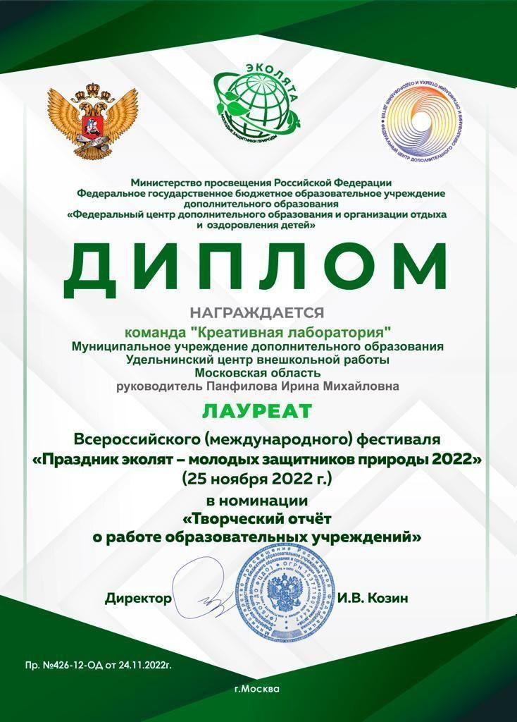 Обучающиеся-волонтёры объединения «Креативная лаборатория» Удельнинского центра внешкольной работы (педагог Панфилова И. М.) стали победителями Всероссийского конкурса «Праздник эколят-молодых защитников природы» в номинации «Отчёт о работе образовательных учреждений».