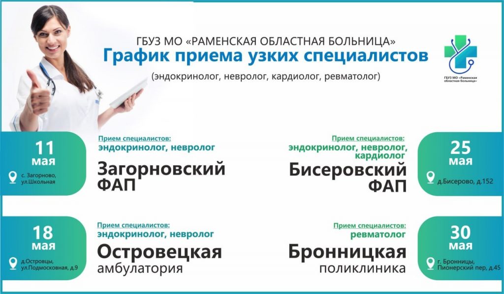 25 мая в Бисеровском ФАПе пройдет прием врача-эндокринолога, врача-невролога и врача-кардиолога по адресу: Раменский г.о., д. Бисерово, д.152