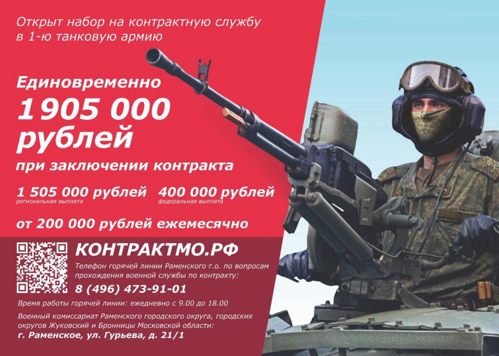 Телефон горячей линии Раменского г.о. по вопросам прохождения военной службы по контракту: 8(496)473-91-01