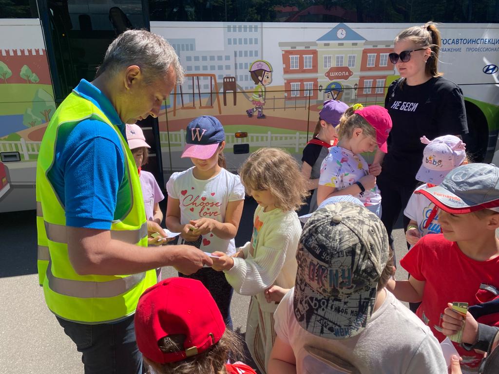 В салоне автобуса присутствовал непослушный пассажир манекен «Гоша», который не был пристегнут ремнями безопасности. В результате демонстрации «резкого торможения» непослушный «Гоша» упал, а дети получили наглядный пример важности использования ремней безопасности.