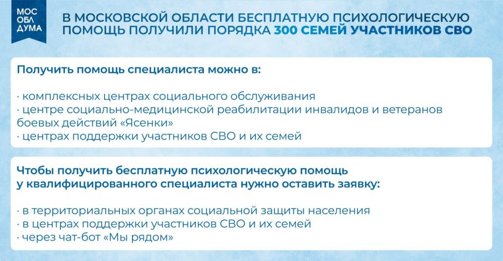 Сейчас одна из главных наших задач – забота о семьях участников специальной военной операции. Герои, которые сегодня защищают нашу страну, должны быть уверены, что их родителям, жёнам, детям, родственникам есть кому помочь, что они не остались один на один со своими вопросами и проблемами: от помощи в социальном обслуживании на дому до кредитных каникул. Особенно важна бывает психологическая помощь. В Московской области она оказывается бесплатно.