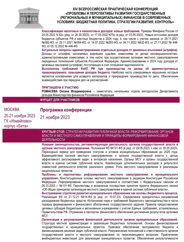 В ходе конференции участники получат комплексные знания о ключевых изменениях бюджетного и налогового законодательства, будут затронуты ключевые характеристики федерального бюджета на 2024 год и на плановый период 2025 и 2026 годов, концепция повышения эффективности бюджетных расходов, будет представлен анализ последних редакций БК РФ и НК РФ, рассмотрены новые источники доходов бюджетов субъектов РФ и местных бюджетов.