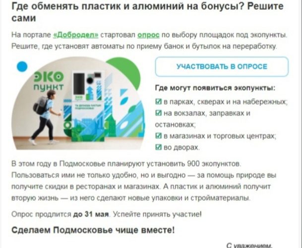 На портале «Добродел» проводится опрос по определению приоритетных мест для установки ЭКОпунктов в Московской области — dobrodel.mosreg.ru.