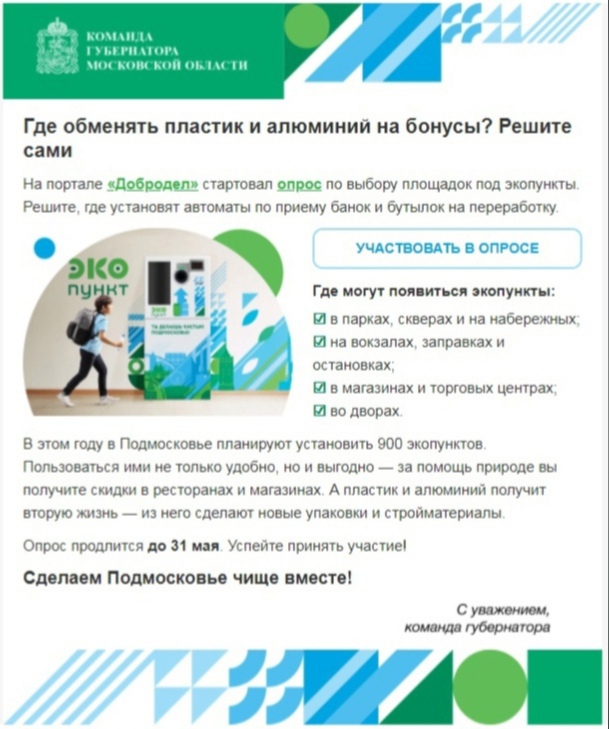 На портале «Добродел» проводится опрос по определению приоритетных мест для установки ЭКОпунктов в Московской области — dobrodel.mosreg.ru.