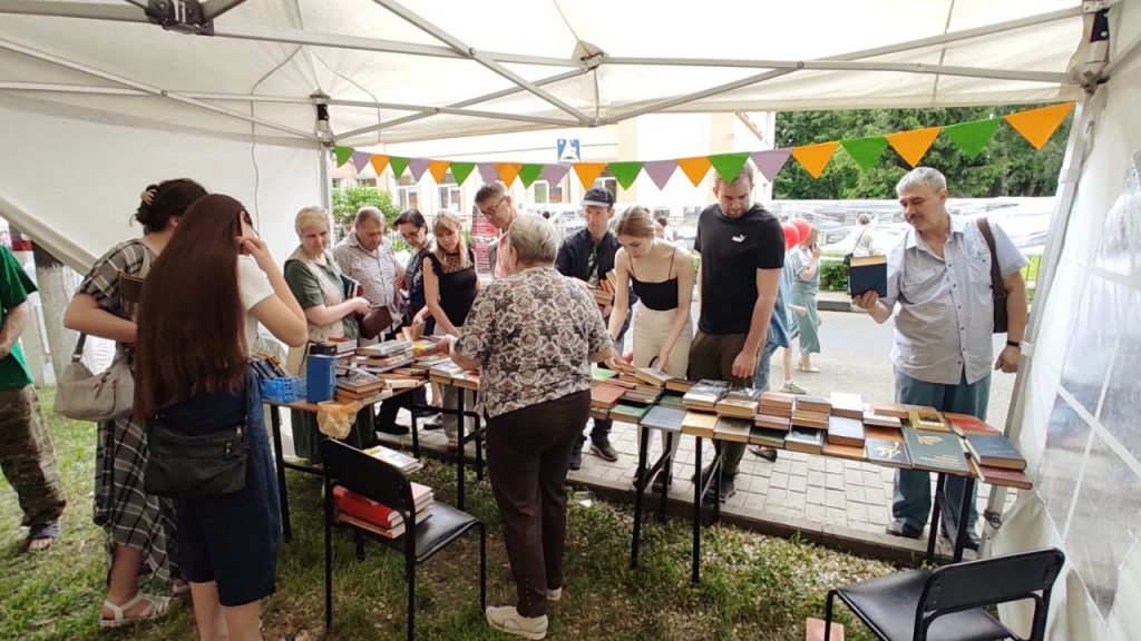 Слева от входа готовятся к началу Дня вязания на публике и бесплатно раздают книги. Справа — музыкальное сопровождение в духе эпохи и прием макулатуры. За каждые 3 кг сданной бумаги можно выбрать вкусное мороженое из холодильника.