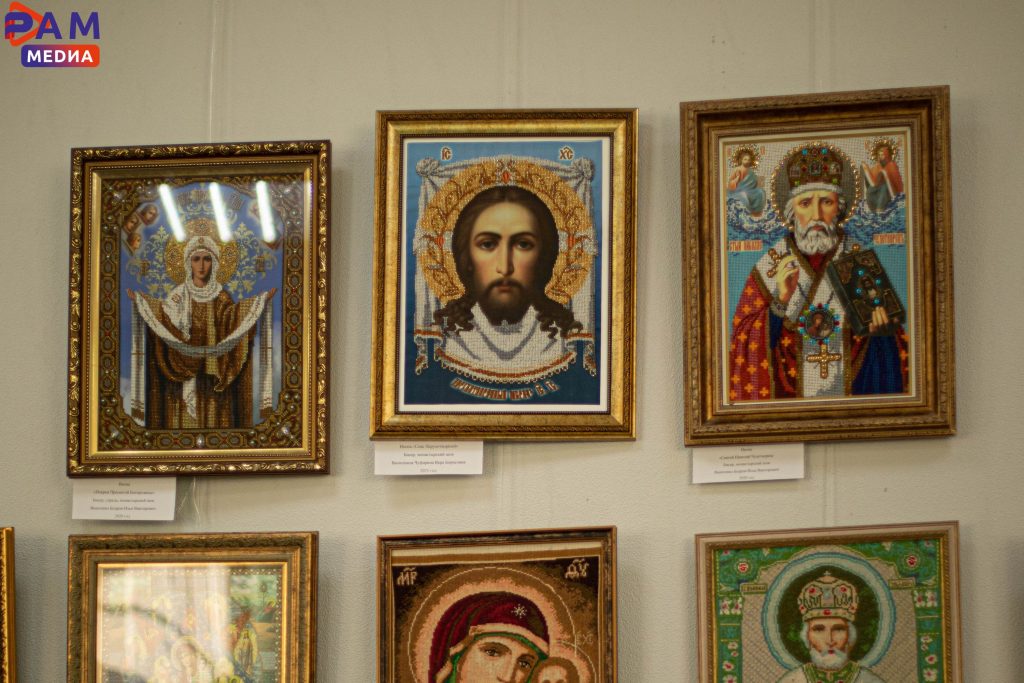 На выставке зрители смогли насладиться работами, где вышивка крестом и бисером оживляет образы Святых, создавая настоящие шедевры.