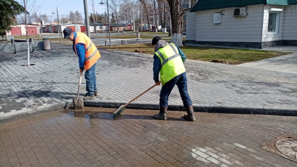 Работы проводят в рамках месячника благоустройства, который традиционно делится на два этапа: уборка снега и мусора с газонов, отмывание и окрашивание бордюров, цоколей и входных групп.