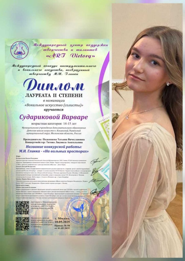 В номинации «Педагог и ученик» также были отмечены: Сударикова Варвара и Подкопаева Т.В. — Лауреаты 1 степени.