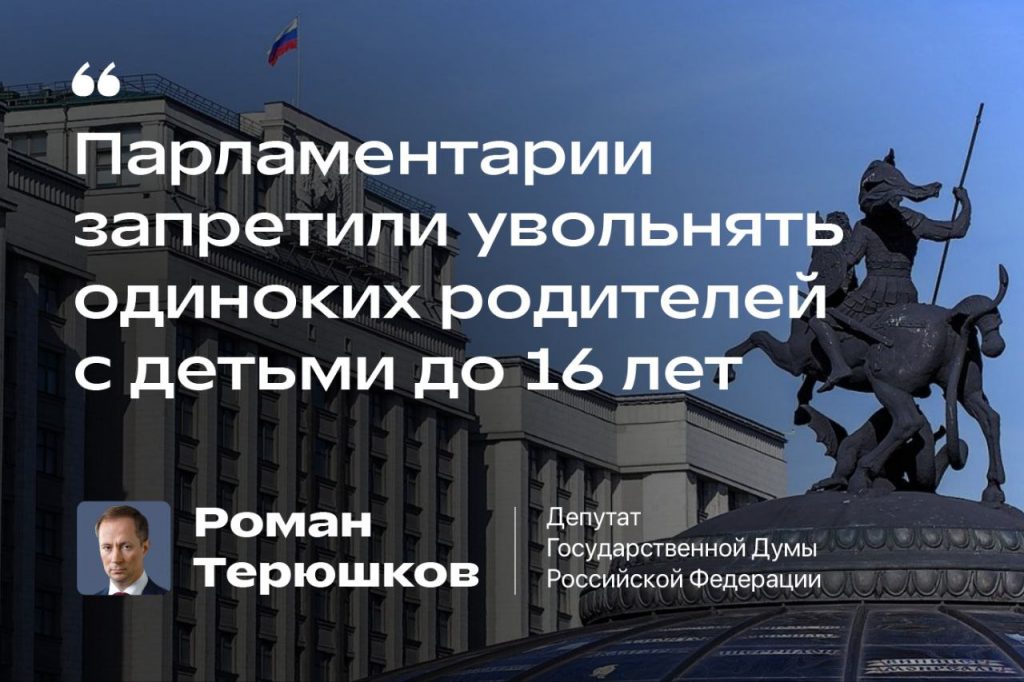 Законопроект, который запрещает работодателям увольнять одиноких матерей с детьми до 16 лет и других лиц, которые воспитывают детей такого возраста без матерей, был принят Государственной Думой в первом чтении. Депутат Госдумы фракции «Единая Россия» Роман Терюшков отметил, что сейчас эта норма распространяется на родителей детей в возрасте до 14 лет.